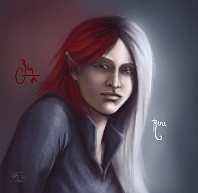 Kcri (6 months, Full Ellearn.)BackgroundRene was born Jay James Red Rose Quele Cross, son of King James Red Rose Quele Cross and Queen Nilec Quele of the Empire of Diria. His name was entirely his father's, as Jay was initially meant to be but an extension of the man.In the Dirian Empire, his parents were known as King ‘James the Insane’ and the ‘Green Eyed Witch’. Nilec had asked her Goddess to bear her vampiric husband a son, which should not have been possible. Wan’an’iena, The Goddess of Control, Time, and Fate agreed to repay her puppet, the prophetess whom she had broken. Nilec before Jay’s birth, had manipulated James whilst the two conquered the desert Empire. Together they both had fallen into the abyss, where the insane thrash in the black seas.Jay was born to play the part of something Nilec could use against her husband as Nilec screamed at her husband at the birth, “You kill me James and I will take him with me!” The two’s fiery relationship goes cold as James begins to call her the 'Ice Cold Bitch" as she uses their newborn as a bargaining chip. The Prince grew up in a household of abuse and neglect, where the common feared him for being both a vampire and James’ son. Evenings of watching his parents' courtly mind games and the brazen killing of courtiers painted a sullied picture. His best friend was his half-sister, and although Mallie was younger than him, she was his aide and his protector. But the secret he lived with and she knew of would become too much and at eleven Jay attempted suicide by stepping out into the noon-day sun. Mallie stopped him.Jay, as he grew, became an angry replica of his father as James did all in his power to create in his son a perfect mirror. At 14 the Prince lost control of Virios and enraged nearly killed his sister. Mallie at this point fled their world leaving him behind to live in hell alone. He would begin killing as a way to feel empowered, hunting beggars and prostitutes in the dying capital city of the Empire. It was only with the faltering heart of another in his hand that Jay felt he had control of his own life as he always had James within his mind.Jay would head south as he became an adult, knowing he must marry for politics. At 24 years of age, he married Prince Joscelin of the southern, Camarian Empire in an arranged match. Their wedding night was a disaster, too much blood, too much wine, and never would there be an excuse for what he did that night. Yet even following that event, it would be Joscelin who would dig into the vampire’s wounds, exposing his weaknesses and his feelings of shame. This was the first person besides Mallie who found out the truth by the graphic scars upon his flesh. Jay struck out in terrified, shameful rage against the Ellearn when Joscelin took it upon himself to tell Nilec what James had done for years to their son without her knowledge.Nilec would go on to murder James with her bare hands as a result of the knowledge of her husband’s perversions. But yet a mind warped by abuse still loved, and Jay blamed himself for James’s death. If he could have only kept the secrets better, James would still be alive. Nilec assumed the throne of Dire Cry by ancient tradition, throwing down the head of the last king before the court. As no woman had held the Dirian throne, the prophetess knew she had to have help. She would convince Jay to assist her on the throne and he fell into the role of scrape goat, allowing the nobles to blame him when all went wrong. But with the birth of his first child, a daughter, Siliv, he knew he had to change. But how?The man Jay’s father had once loved, long ago offered to help Jay. Riq’ua Riviria, the most ancient Ellearn on Cor'Terrae would teach the Prince patience, love, and kindness. This was a making up for the failure of Jay’s father. Jay would try to curb his violent nature, appealing to Joscelin, wanting the marriage to succeed. Yet, they would argue still.He would take a new name for a new man. Rene, Rebirth. He refused to continue his father’s legacy with his children and came to find that he dearly loved children. He felt guilt as his daughter was half-vampiric and because of that she would have a cursed life as well. This guilt would only be compounded by his rocky relationship with Joscelin. Rene strives to repair the relationship that has fallen apart but believes he does not deserve a second chance after his initial abuse of his husband when he knew no better. Though in his heart, he yearns for that second chance he will never be given.In Diria, Rene took the title of King to be his mother’s worshiper, her captive, and her butcher. Assigned the position of her assassin, Rene even now still allows his leash to be held, to be yanked by the woman who had herself, lost her mind over a century ago. She had ultimately dragged her husband down with her into the Abyss because fate had dictated it would be so. Rene will not give up his parents regardless of the past and he still obeys her, even when he knows the cycle of manipulation and lies that were spun just continues…Once there was a mother, a father, and a son.