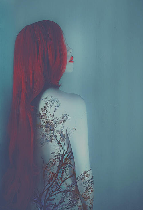 Tattoos/Piercings: As seen in the above photo, Miressë has vine and flower tattooing that goes from the very end of her tailbone upwards. It spreads up her back and over her right side and right arm.