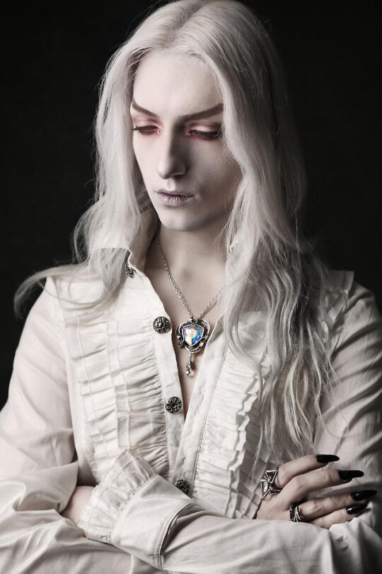 Other Physical Details:Rene sometimes wears makeup as his features are so pale. He will wear eyeliner, and kohl (eyeshadow.) Rene has had his eyebrows which were so pale no one could see them, regularly shaved. He has black tattooed brows instead.Ellaern with their average height of 6’2, have 0.8 the bone density of humans, allowing for this increased height with lower body mass in an environment with 70% the gravity of Earth. They have elongated limbs and a longer thorax with an unusually skinny frame that makes them appear lean and almost spindly. Their joints are loose (highly flexible) and some are even naturally hyper-extended, (which lowers the strength in the limbs if being used past a 180-degree angle.) This bone density does not lower Rene’s strength because of his unnatural Vampiric abilities.